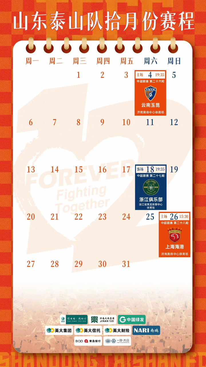 2025年10月山东泰山有3场中超比赛,分别是10月4日主场对阵云南玉昆、10月18日客场挑战浙江队以及10月26日主场迎战上海海港。其中,10月26日对阵上海海港的比赛是关键一战,备受全国球迷关注。