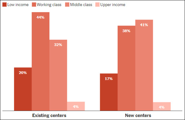 美国的血浆中心选址发生转移,自2021年以来,血浆中心更倾向于在中产阶级社区开设。此图为全美现有(左侧)和新建(右侧)血浆中心在各收入群体中的分布比例。《纽约时报》制图