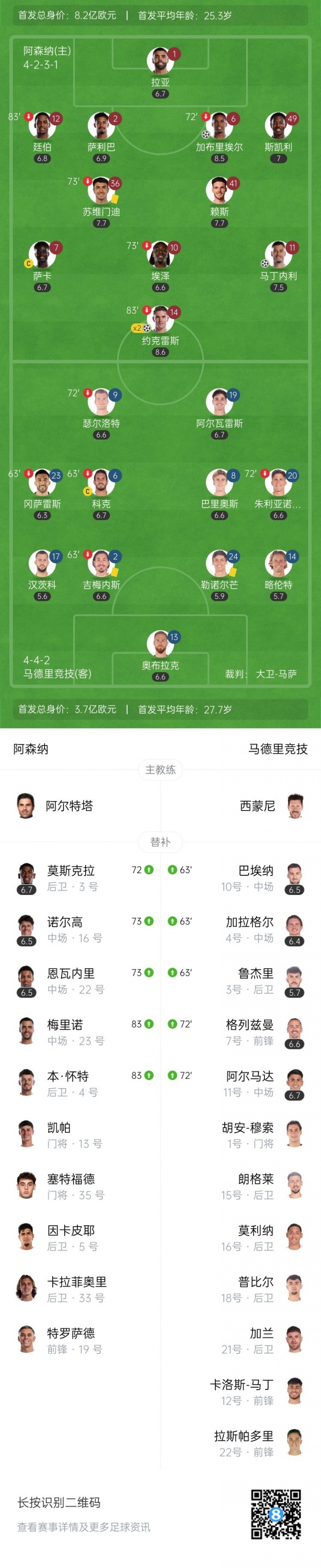直播吧10月22日讯马竞本轮0-4遭阿森纳横扫,西蒙尼在第63分钟做了一次连换3人的调整,巴埃纳、加拉格尔、鲁杰里上场,换下吉梅内斯、冈萨雷斯和科克。