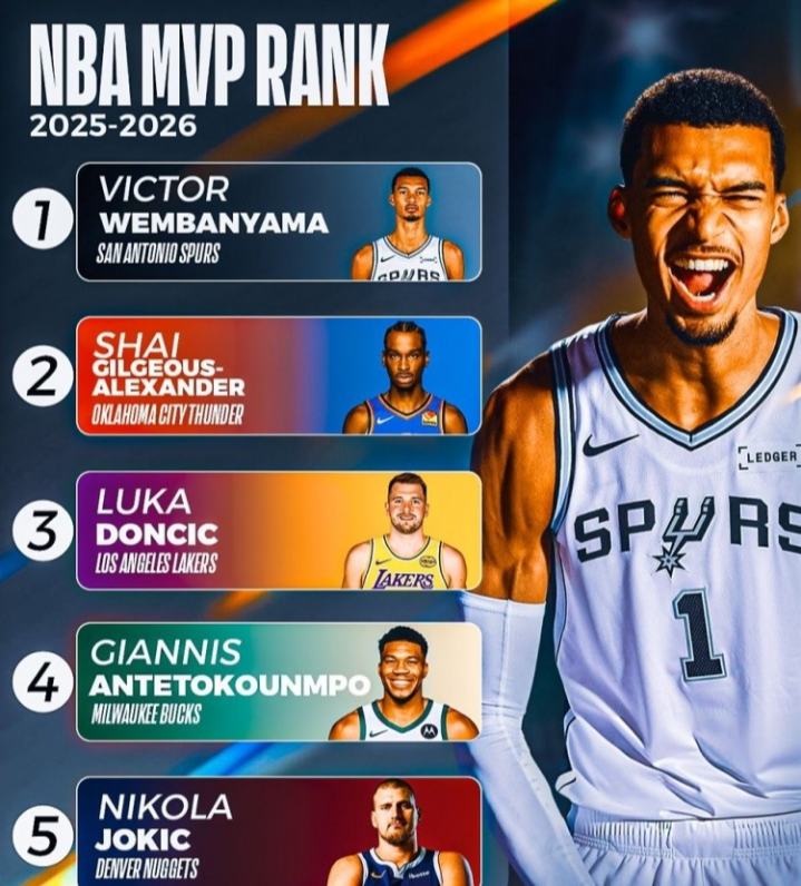 今天早些时候,美媒给出的的本赛季MVP排行榜中,文班亚马力压亚历山大成为榜首,往下是,东契奇排名第3,字母哥排名第四,约基奇排名第五。