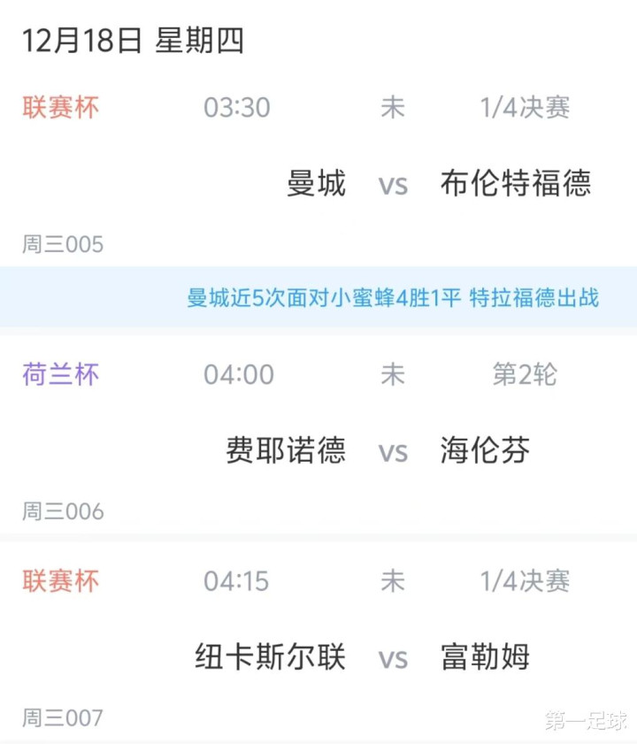 曼城VS布伦特福德,曼城近期状态实在太好了,对水晶宫一战显示了王者的风范,又成为了英超夺冠大热门。布伦特福德今年表现真的很一般,都快掉到降级区了。周六两队都还有英超比赛,这场肯定都会有一定的轮换,还是看好曼城晋级,但赢的不会很简单,比分预测为1比0,2比1,3比1。