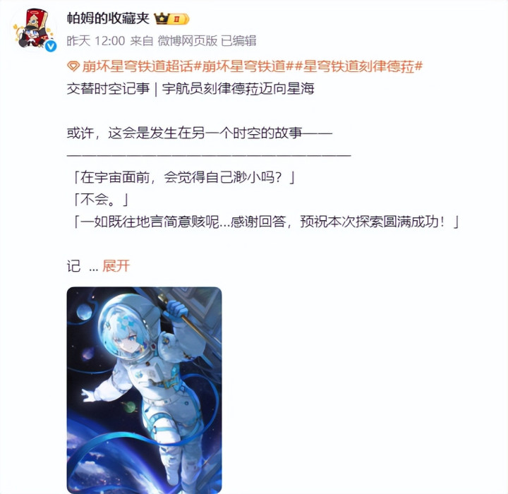 最近,为了庆祝刻律德菈的上线,官方也是约了画师,绘制了另一个平行时空里的刻律德菈,立绘上的刻律德菈实现了她的愿望,来到了天外的世界,这一世她是一名宇航员,这样的设定也让无数玩家被深深触动。