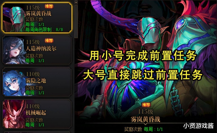 三是打雾岚黄昏战团本!在打之前有2件事情是需要注意的 ,一是记得用小号完成前置主线任务,完成后返回大号点击“直接完成任务”就能跳过任务了。