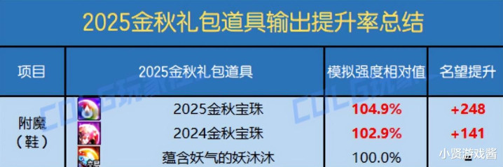 输出职业的腰、鞋宝珠,相较于2024 年金秋宝珠,提升了214 点名望,伤害提升了 3.84%